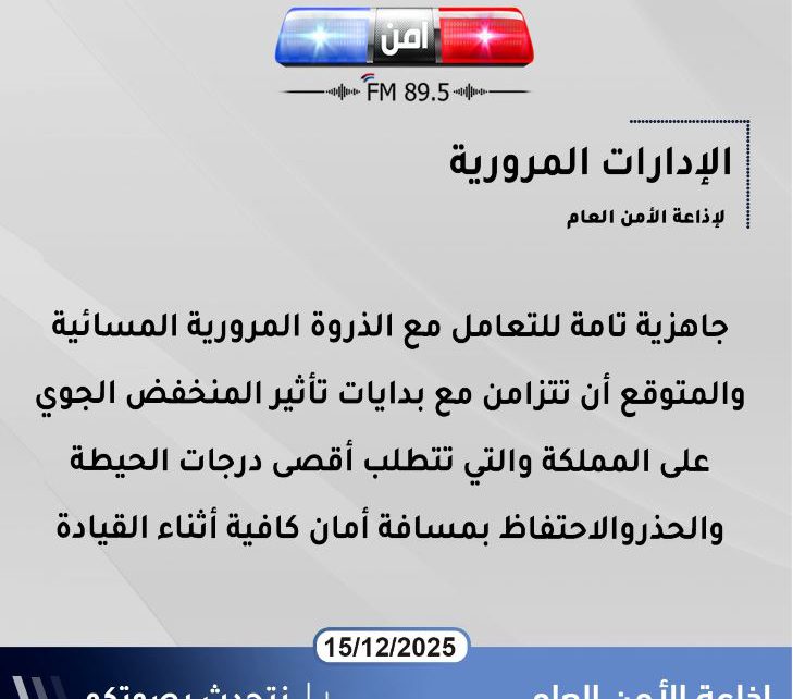 جاهزية تامة للتعامل مع الذروة المرورية المسائية والمتوقع أن تتزامن مع بدايات تأثير المنخفض الجوي على المملكة والتي تتطلب أقصى درجات الحيطة والحذر والاحتفاظ بمسافة أمان كافية أثناء القيادة.
