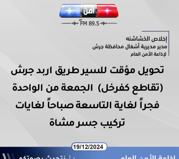 إخلاص الخشاشنه مدير مديرية أشغال محافظة جرش لإذاعة الأمن العام : تحويل مؤقت للسير طريق اربد جرش (تقاطع كفرخل) الجمعة من الواحدة فجراً لغاية التاسعة صباحاً لغايات تركيب جسر مشاة.