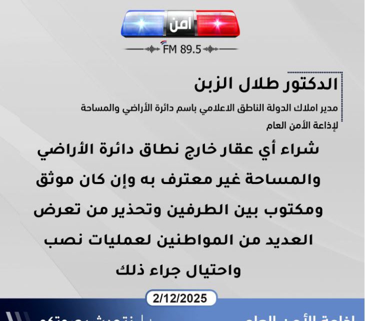 مدير املاك الدولة الناطق الاعلامي باسم دائرة الأراضي والمساحة الدكتور طلال الزبن لإذاعة الأمن العام : شراء أي عقار خارج نطاق دائرة الأراضي والمساحة غير معترف به وإن كان موثق ومكتوب بين الطرفين وتحذير من تعرض العديد من المواطنين لعمليات نصب واحتيال جراء ذلك.