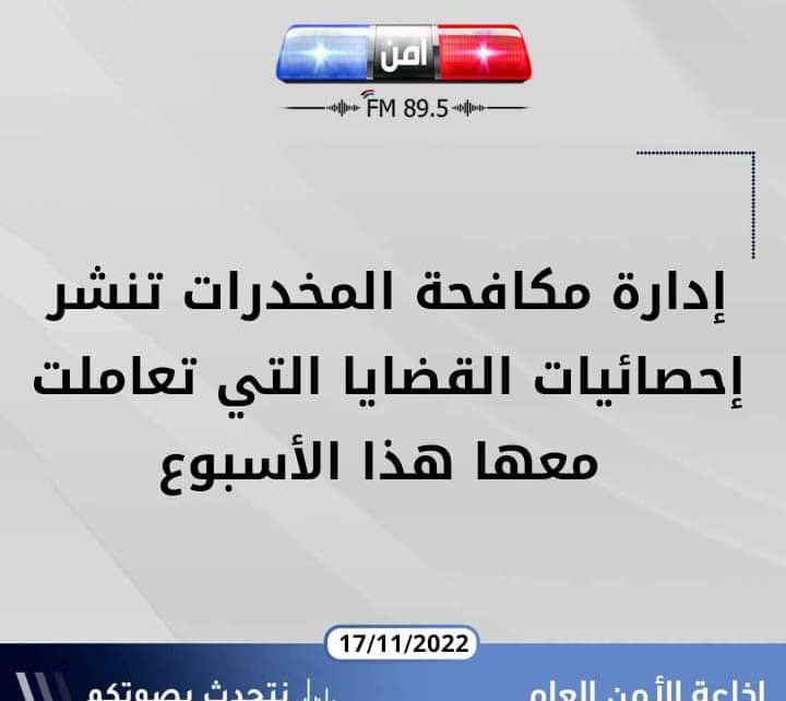 إدارة مكافحة المخدرات تنشر إحصائيات القضايا التي تعاملت معها هذا الأسبوع