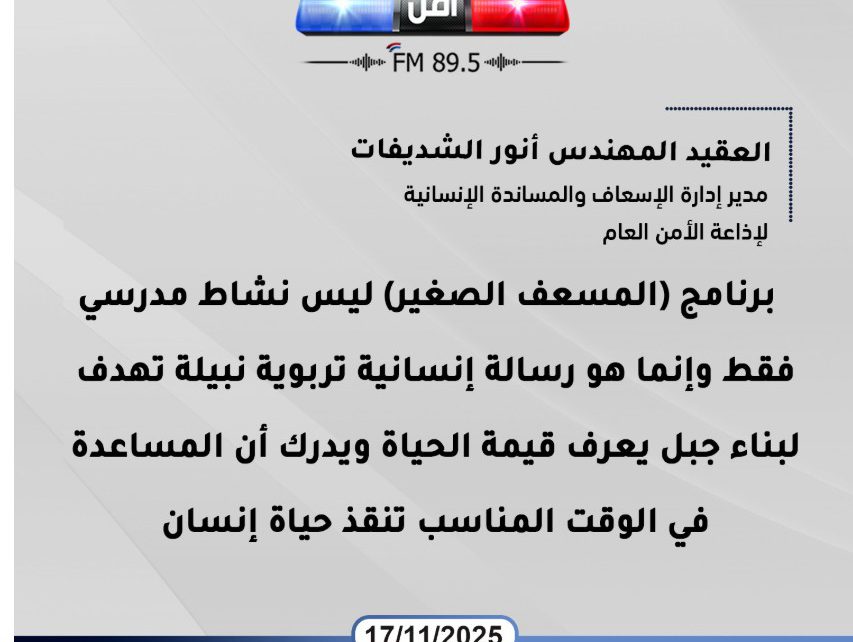 العقيد المهندس أنور الشديفات مدير إدارة الإسعاف والمساندة الإنسانية لإذاعة الأمن العام: برنامج (المسعف الصغير) ليس نشاط مدرسي فقط وإنما هو رسالة إنسانية تربوية نبيلة تهدف لبناء جبل يعرف قيمة الحياة ويدرك أن المساعدة في الوقت المناسب تنقذ حياة إنسان.