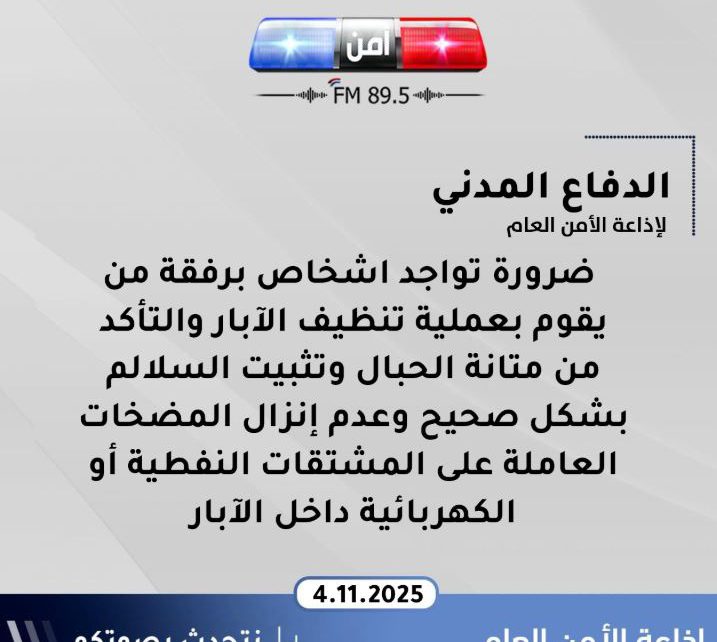 الدفاع المدني لإذاعة الأمن العام : تقديم الإسعافات الأولية ل(1467) حاله مرضية وتأمينها للمستشفيات والسيطرة الفورية على (87) حادث حريق والاستجابة باحترافية عالية ل(120) حادث إنقاذ خلال ال 24 ساعة الماضية