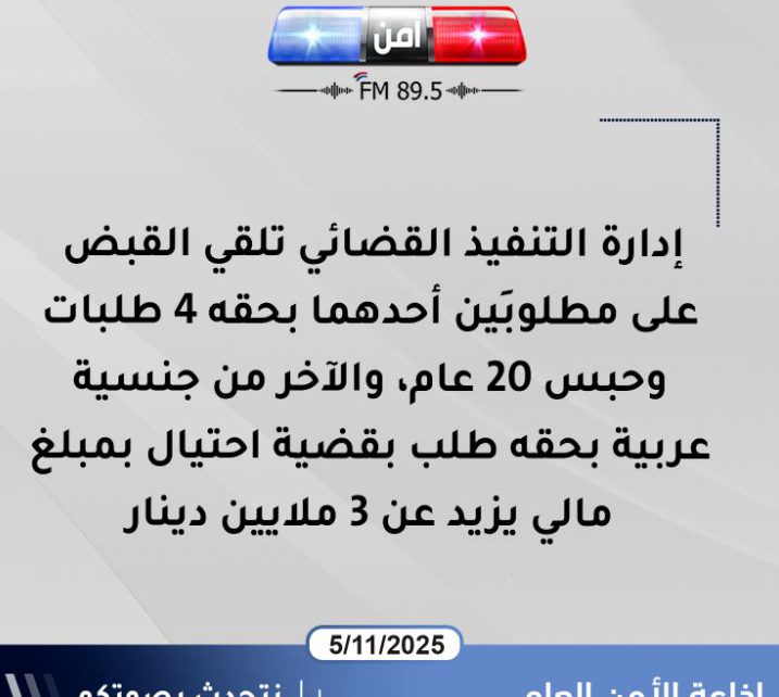 إدارة التنفيذ القضائي تلقي القبض على مطلوبَين أحدهما بحقه 4 طلبات وحبس 20 عام والآخر من جنسية عربية بحقه طلب بقضية احتيال بمبلغ مالي يزيد عن 3 ملايين دينار