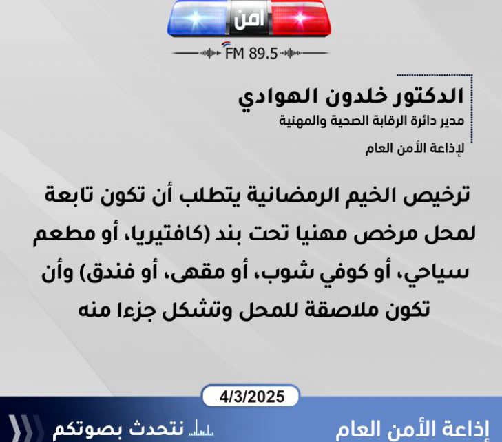 ترخيص الخيم الرمضانية يتطلب أن تكون تابعة لمحل مرخص مهنيا تحت بند (كافتيريا، أو مطعم سياحي، أو كوفي شوب، أو مقهى، أو فندق) وأن تكون ملاصقة للمحل وتشكل جزءا منه .