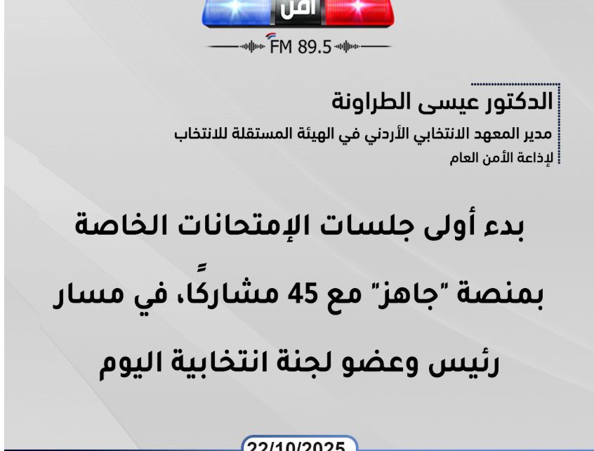 الدكتور عيسى الطراونة مدير المعهد الانتخابي الأردني في الهيئة المستقلة للانتخاب : بدء أولى جلسات الإمتحانات الخاصة بمنصة “جاهز” مع 45 مشاركاً، في مسار رئيس وعضو لجنة انتخابية اليوم.