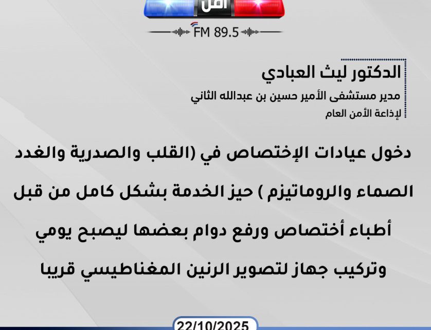 الدكتور ليث العبادي مدير مستشفى الأمير حسين بن عبدالله الثاني: دخول عيادات الإختصاص في (القلب والصدرية والغدد الصماء والروماتيزم ) حيز الخدمة بشكل كامل من قبل أطباء أختصاص ورفع دوام بعضها ليصبح يومي وتركيب جهاز لتصوير الرنين المغناطيسي قريبا.