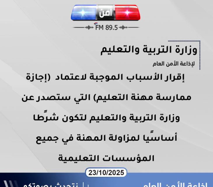 إجازة ممارسة مهنة التعليم تعزز كفاءة المنظومة التربوية وتكفل حق الطلبة في تعليم نوعي ومتميز وسيُطبق النظام فعليًا على المعلمين الذين سيتم تعيينهم اعتبارًا من بداية العام الدراسي 2027–2028.