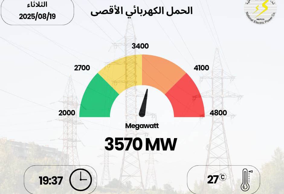 3570 ميجا واط الحمل الكهربائي الأقصى المسجل امس