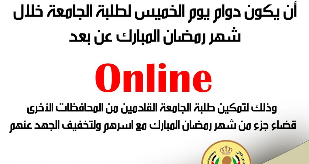 تحويل دوام يوم الخميس للطلبة خلال شهر رمضان المبارك في جامعة الحسين بن طلال عن بعد