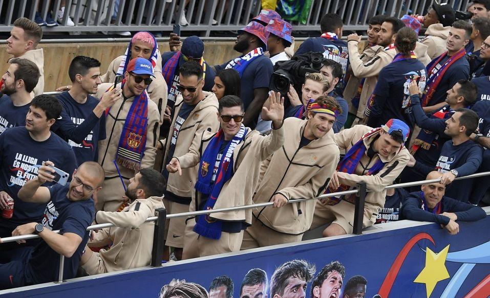 فريق برشلونة يجوب شوارع المدينة في حافلة مكشوفة احتفالاً بلقب الليغا