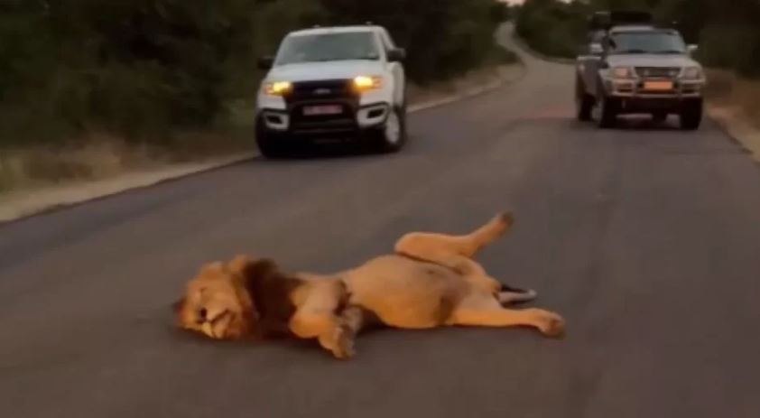 أسد منهك وسط الطريق بعد أن أتخمه تناول زرافة (فيديو)