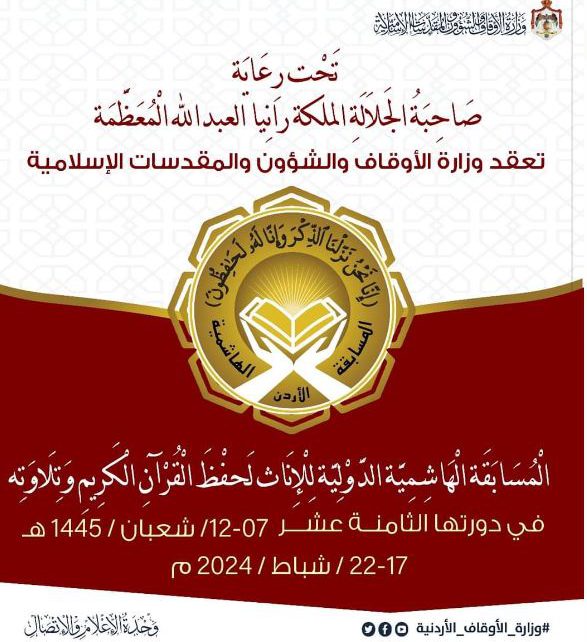 وزارة الأوقاف والشؤون والمقدسات الإسلامية تعلن عن انطلاق فعاليات المسابقة الهاشمية الدولية للإناث لحفظ القرآن الكريم وتلاوته في دورتها الـ 18 يوم غد السبت.
