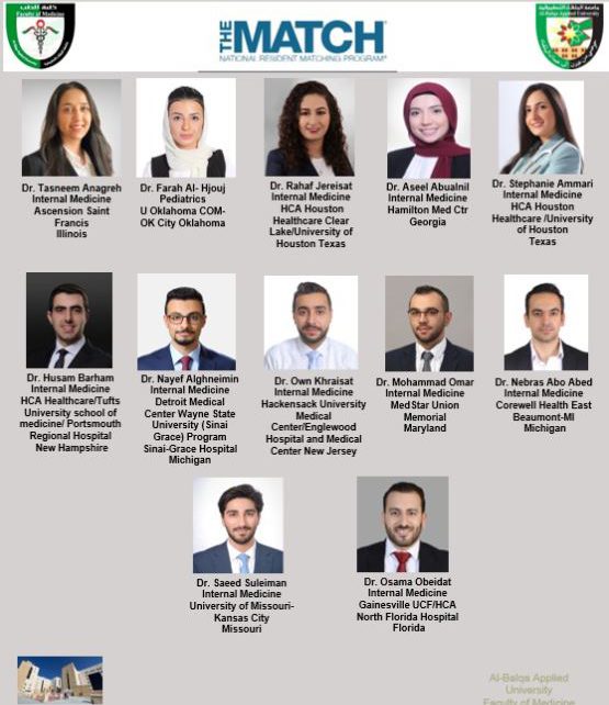 اثنا عشر طبيبا من خريجي طب البلقاء التطبيقية في ” قبولات التدريب السريري في برامج الإقامة في الولايات المتحدة الأمريكية