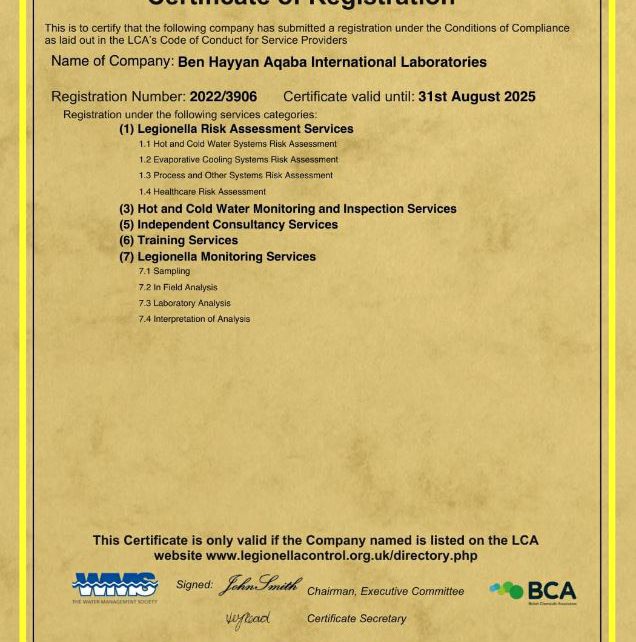 إنجاز دولي لمختبرات العقبة الدولية – بن حيان في “مجال تقييم مخاطر بكتيريا الليجونيلا “