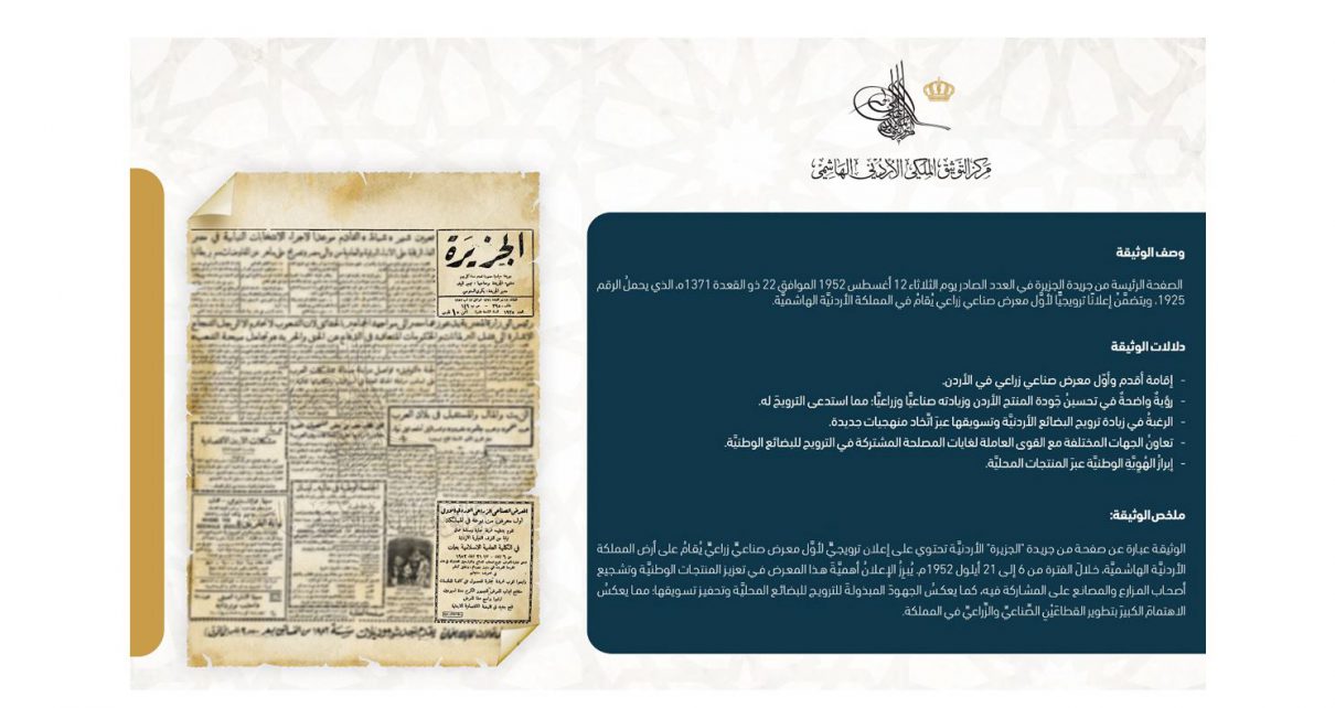 التوثيق الملكي يعرض وثيقة إعلان أول معرض صناعي زراعي بالأردن