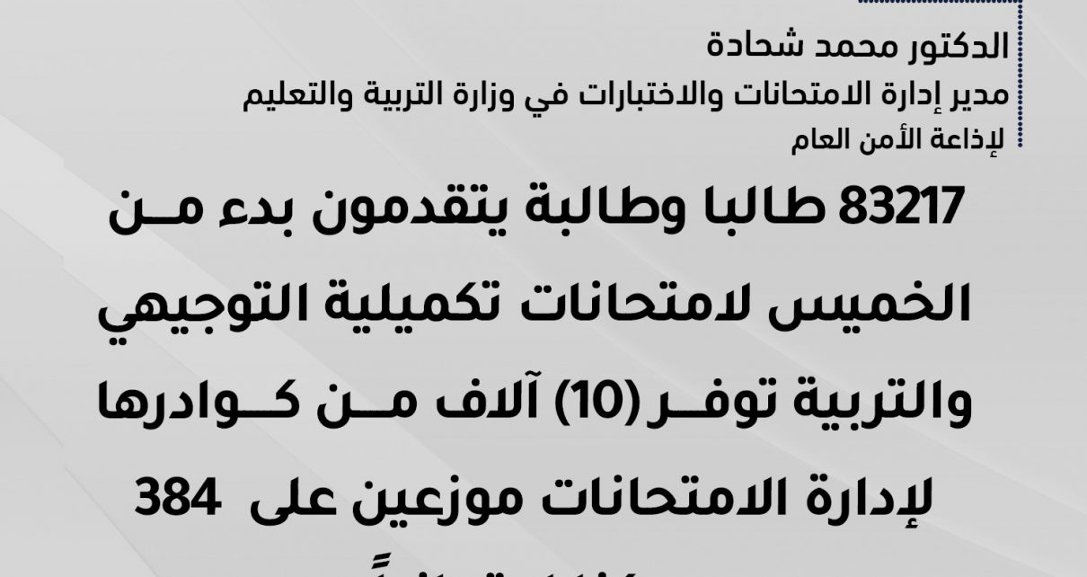 – 83217 طالبا وطالبة يتقدمون بدء من الخميس لامتحانات تكميلية التوجيهي والتربية توفر (10) آلاف من كوادرها لإدارة الامتحانات موزعين على 384 مركزا إمتحانياً.