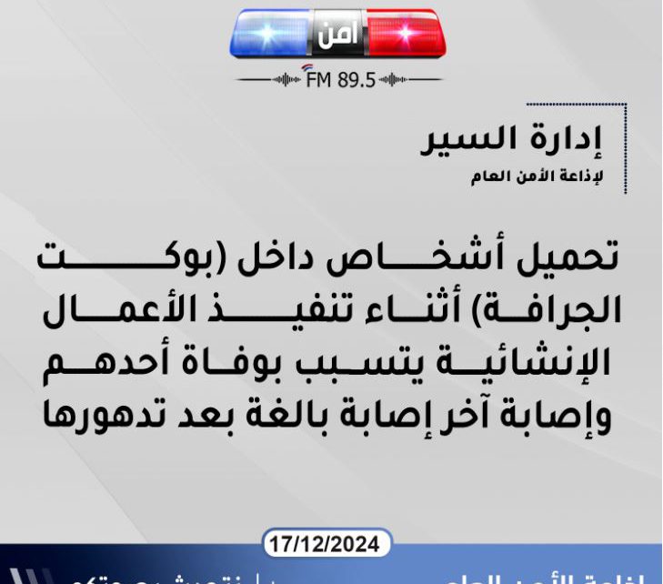 إدارة السير لإذاعة الأمن العام : تحميل أشخاص داخل (بوكت الجرافة) أثناء تنفيذ الأعمال الإنشائية يتسبب بوفاة أحدهم وإصابة آخر إصابة بالغة بعد تدهورها.