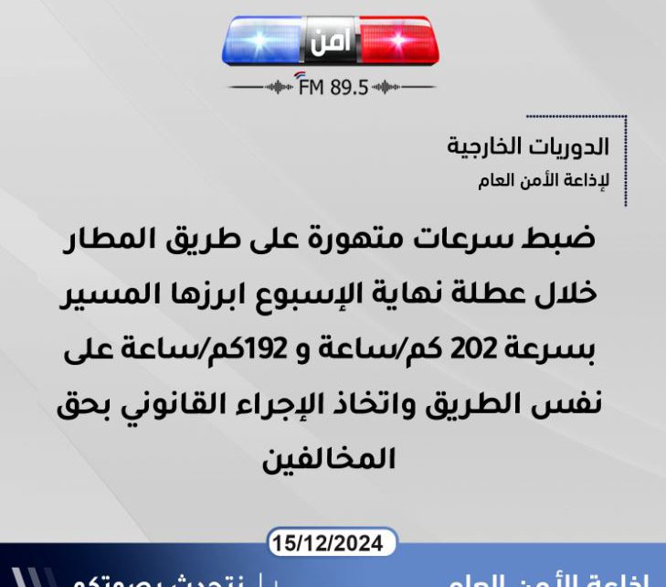 الدوريات الخارجية لإذاعة الأمن العام : ضبط سرعات متهورة على طريق المطار خلال عطلة نهاية الإسبوع