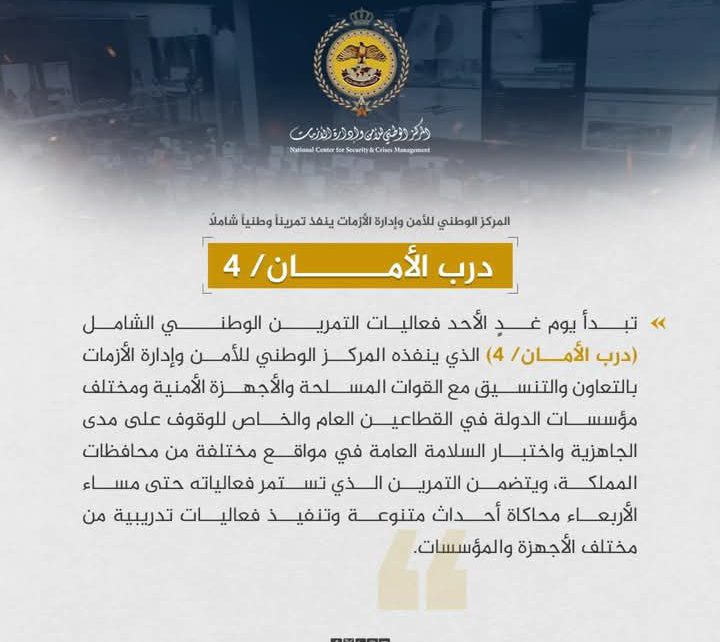 المركز الوطني للأمن وإدارة الأزمات ينفذ تمريناً وطنياً شاملاً (درب الأمان /4)