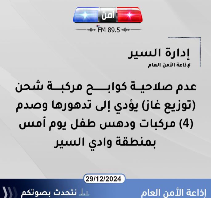 إدارة السير لإذاعةالامن العام : عدم صلاحية كوابح مركبة شحن (توزيع غاز) يؤدي إلى تدهورها وصدم (4) مركبات ودهس طفل يوم أمس بمنطقة وادي السير.