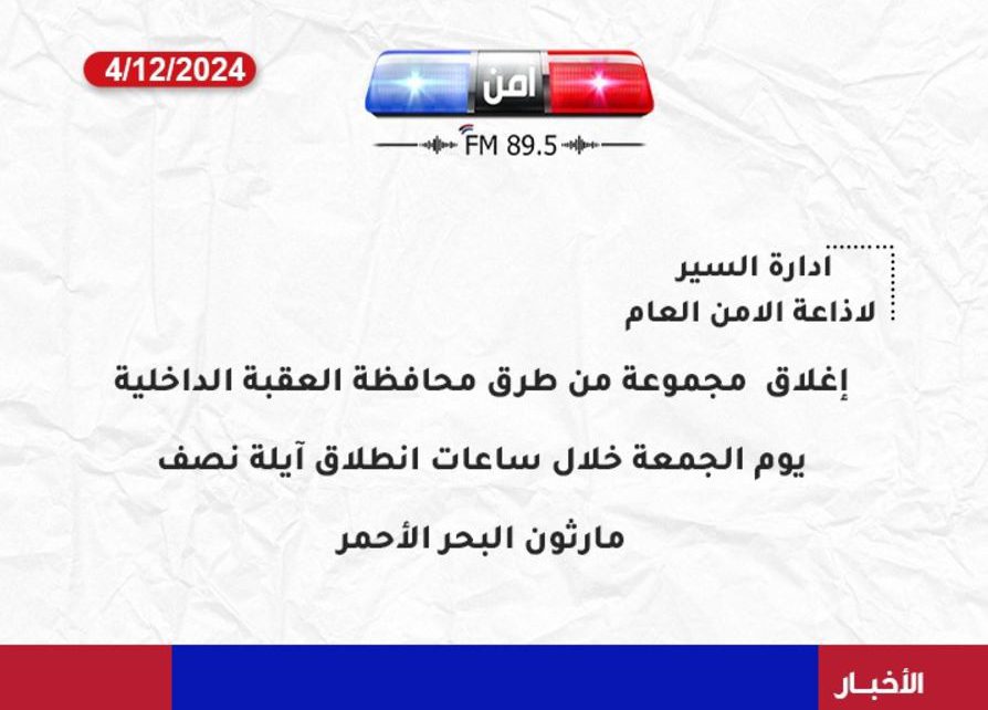 إدارة السير لإذاعة الأمن العام : إغلاق مجموعة من طرق محافظة العقبة الداخلية يوم الجمعة خلال ساعات انطلاق نصف مارثون آيلة البحر الأحمر.