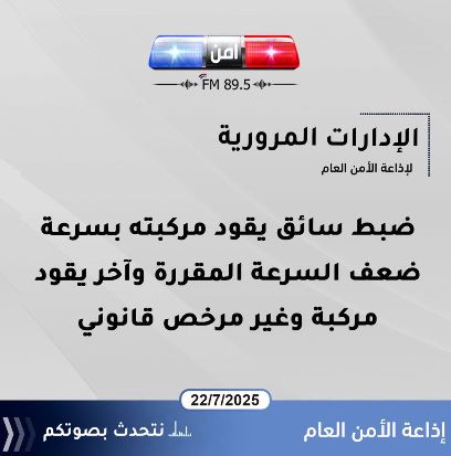 الإدارات المرورية لإذاعة الأمن العام : ضبط سائق يقود مركبته بسرعة ضعف السرعة المقررة وأخر يقود مركبه وغير مرخص قانوني