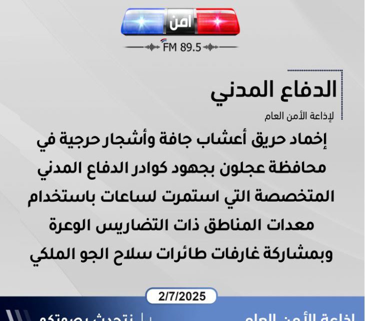 الدفاع المدني لإذاعة الأمن العام : إخماد حريق أعشاب جافة وأشجار حرجية في محافظة عجلون بجهود كوادر الدفاع المدني المتخصصة التي استمرت لساعات باستخدام معدات المناطق ذات التضاريس الوعرة وبمشاركة غارفات طائرات سلاح الجو الملكي.