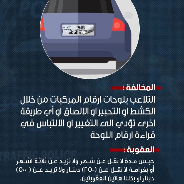 الأمن العام: إخفاء لوحات الأرقام أو التلاعب بها فعل يثير الشبهات وعقوبته تصل ل 3 أشهر وغرامة تصل ل 500 دينار