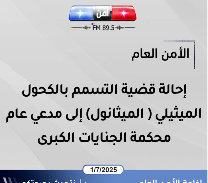 الأمن العام :إحالة قضية التسمم بالكحول الميثيلي ( الميثانول) إلى مدعي عام محكمة الجنايات الكبرى