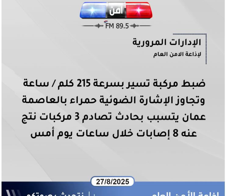 الإدارات المرورية لإذاعة الأمن العام : ضبط مركبة تسير بسرعة 215 كلم / ساعة وتجاوز الإشارة الضوئية حمراء بالعاصمة عمان يتسبب بحادث تصادم 3 مركبات نتج عنه 8 إصابات خلال ساعات يوم أمس