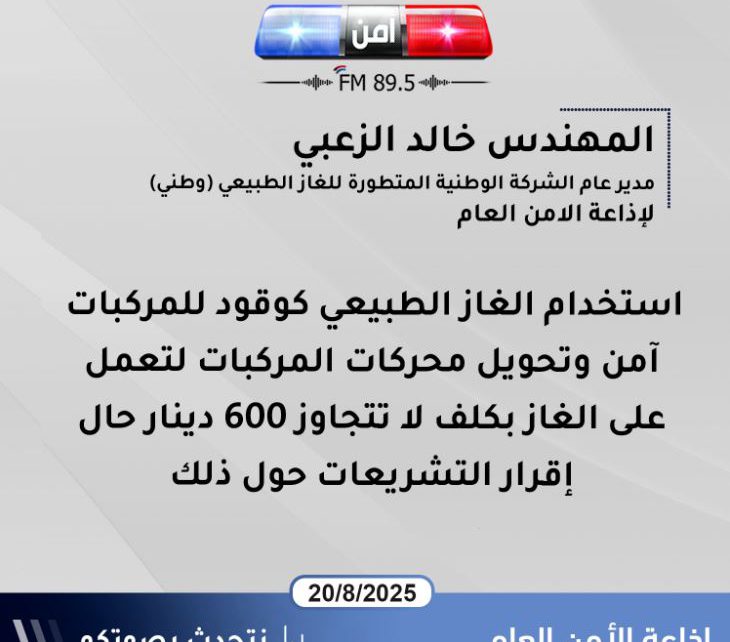 المهندس خالد الزعبي مدير عام الشركة الوطنية المتطورة للغاز الطبيعي (وطني) لإذاعة الأمن العام : انخفاض كلف النقل والشحن البري باستخدام الغاز الطبيعي كوقود بنسبة تصل إلى 50%.