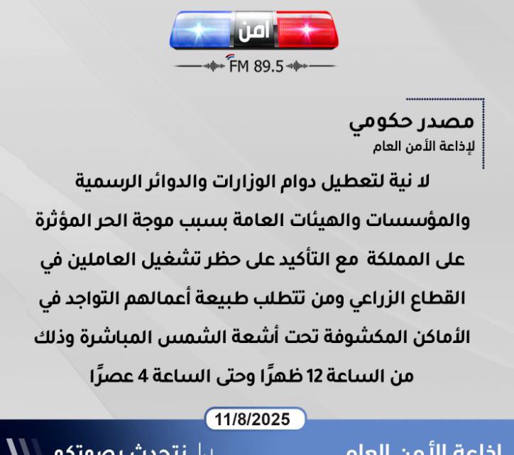 لا نية لتعطيل دوام الوزارات والدوائر الرسمية والمؤسسات والهيئات العامة بسبب موجة الحر المؤثرة على المملكة