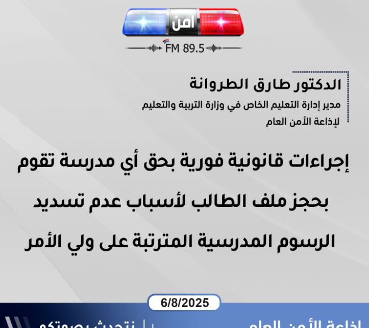 إجراءات قانونية فورية بحق أي مدرسة تقوم بحجز ملف الطالب لأسباب عدم تسديد الرسوم المدرسية المترتبة على ولي الأمر.