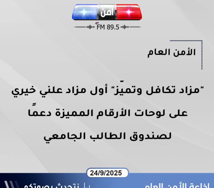 الأمن العام : “مزاد تكافل وتميّز” أول مزاد علني خيري على لوحات الأرقام المميزة دعماً لصندوق الطالب الجامعي