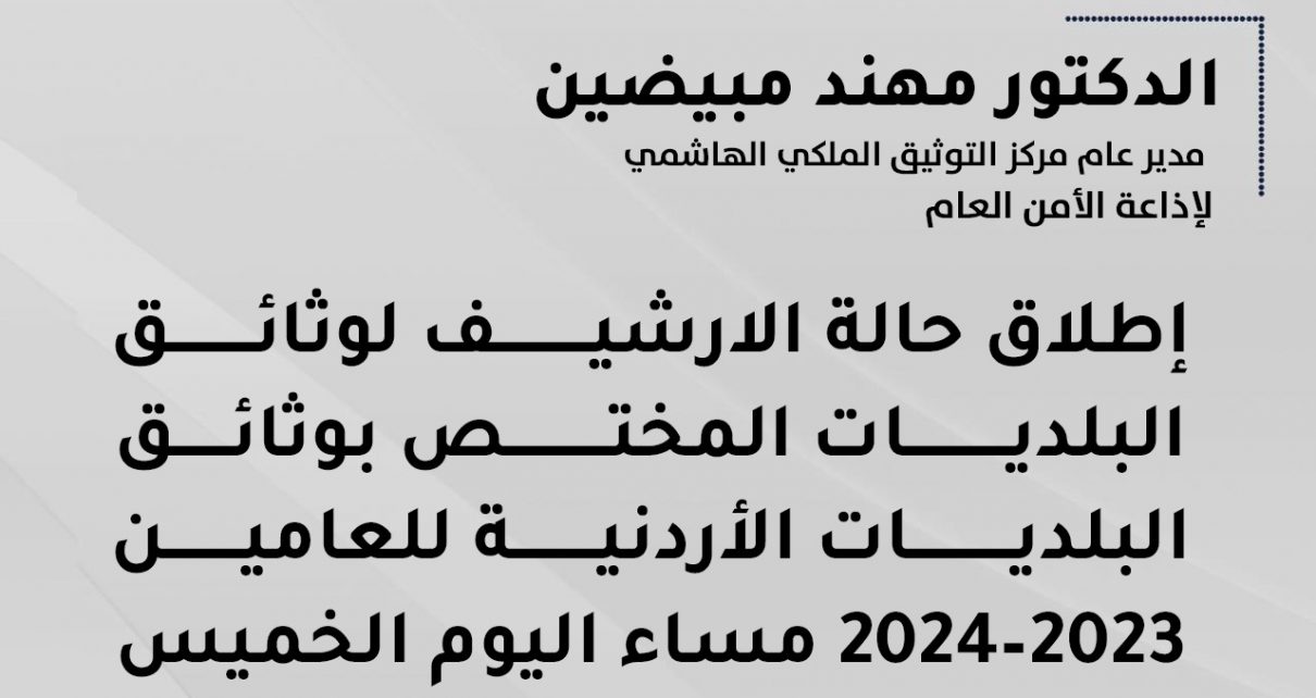 مركز التوثيق الملكي الهاشمي :إطلاق حالة الارشيف لوثائق البلديات المختص بوثائق البلديات الأردنية للعامين 2023–2024 مساء اليوم الخميس.