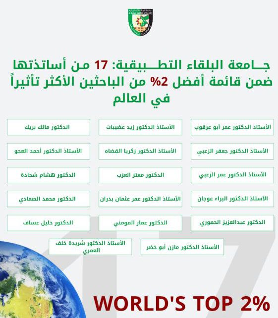 جامعة البلقاء التطبيقية: 17 من أساتذتها ضمن قائمة أفضل 2% من الباحثين الأكثر تأثيراً في العالم