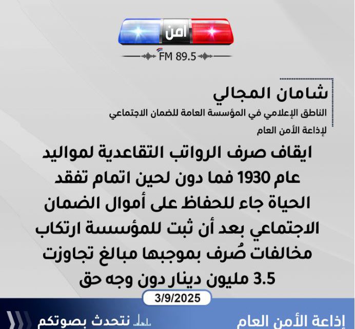 ايقاف صرف الرواتب التقاعدية لمواليد عام 1930 فما دون لحين اتمام تفقد الحياة جاء للحفاظ على أموال الضمان الاجتماعي بعد أن ثبت للمؤسسة ارتكاب مخالفات صُرف بموجبها مبالغ تجاوزت 3.5 مليون دينار دون وجه حق.