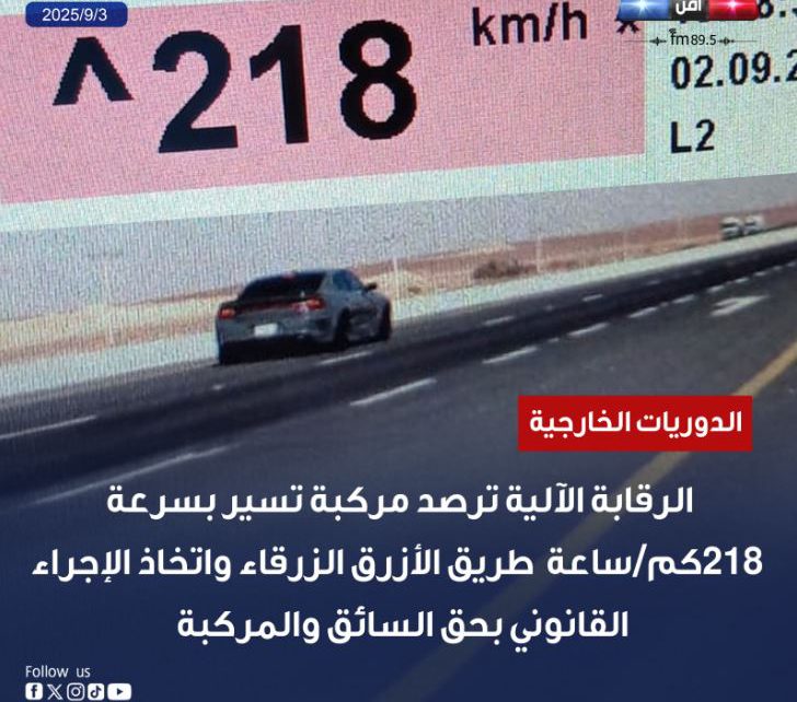 الرقابة الآلية للدوريات الخارجية ترصد مركبة تسير بسرعة 218كم/ساعة طريق الأزرق الزرقاء واتخاذ الإجراء القانوني بحق السائق والمركبة
