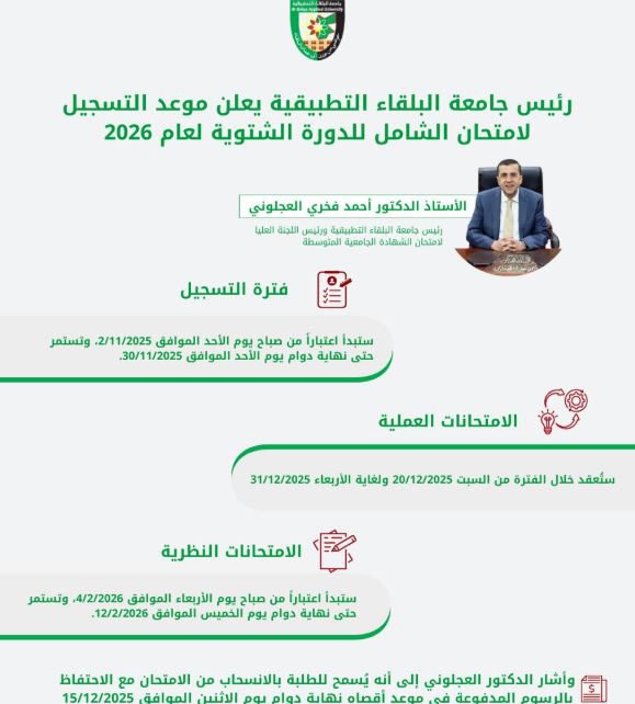 رئيس جامعة البلقاء التطبيقية يعلن موعد التسجيل لامتحان الشامل للدورة الشتوية لعام 2026