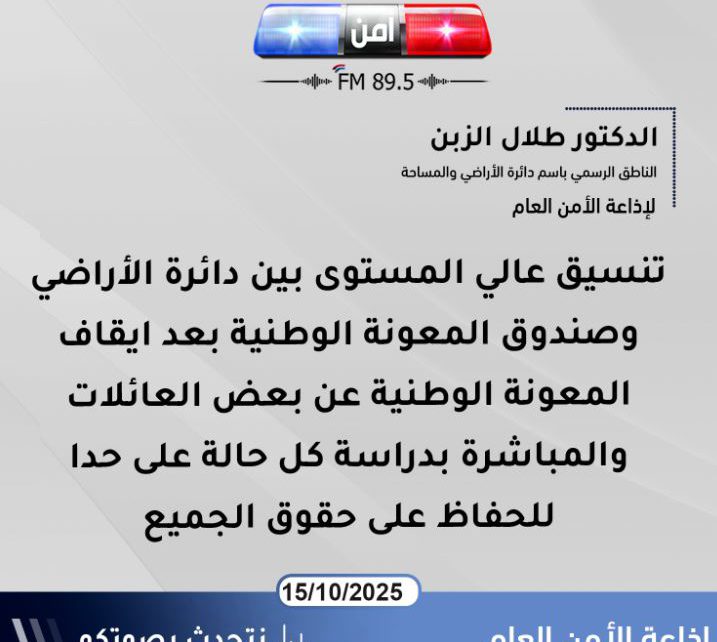 الدكتور طلال الزبن الناطق الرسمي باسم دائرة الأراضي والمساحة لإذاعة الأمن العام : تنسيق عالي المستوى بين دائرة الأراضي وصندوق المعونة الوطنية بعد ايقاف المعونة الوطنية عن بعض العائلات والمباشرة بدراسة كل حالة على حدا للحفاظ على حقوق الجميع.
