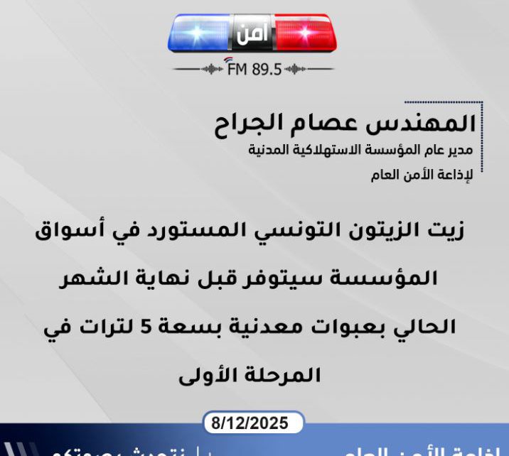 المؤسسة الاستهلاكية المدنية زيت الزيتون التونسي المستورد في أسواق المؤسسة سيتوفر قبل نهاية الشهر الحالي بعبوات معدنية بسعة 5 لترات في المرحلة الأولى
