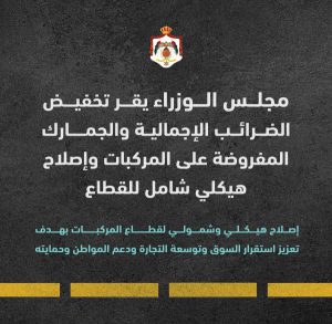 ورحبت جمعية وكلاء السيارات في الأردن بقرارات الحكومة واعتبرتها خطوة مهمة نحو إصلاح التشوهات المتراكمة في قطاع المركبات، ومعالجة اختلالات طال انتظار تصحيحها.