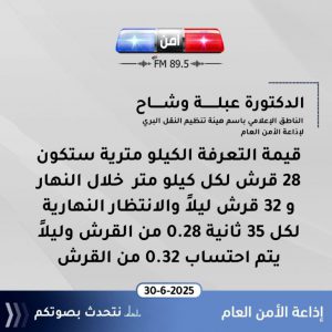 وأشارت الدكتورة وشاح إلى أن تعرفة الانتظار وهي مقسمة حسب معادلة الاحتساب ليلا ونهاريا حيث ستبلغ قيمة تعرفة الانتظار النهارية لكل 35 ثانية يتم احتساب العداد 0.28 قرش على العداد ، وليلاً يتم احتساب 0.32 قرش لكل 35 ثانية انتظار.