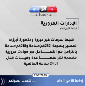 مؤكدا أن القيادة بهذه السرعة القاتلة تؤدي إلى وقوع الحوادث التي ينتج عنها وفيات وإصابات لا سمح الله كما أكد على الجاهزية التامة لضبط المخالفات الخطرة واتخاذ المقتضى القانوني بحق المخالفين