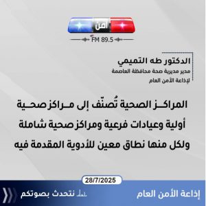 أكد مدير مديرية صحة محافظة العاصمة، الدكتور طه التميمي، على أن المراكز الصحية التابعة لوزارة الصحة تُصنّف إلى: مراكز صحية أولية، وعيادات فرعية، ومراكز صحية شاملة. ويتميز كل نوع منها بنطاق معين للأدوية المقدمة فيه، حيث تختلف قائمة الأدوية المقدمة في العيادات الفرعية عن تلك المتوفرة في المراكز الأولية، وتختلف كذلك عن الأدوية المتوفرة في المراكز الشاملة.