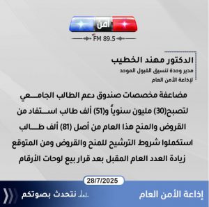وقال انه لا يمكن حاليا معرفة كم العدد المتوقع أن يتم زيادته لان ذلك يعتمد على قيمة المبالغ التي سيتم تحصيلها وكم قيمتها ولكن من المؤكد أنه سيكون هناك زيادة لأعداد الطلاب وسيكون هناك أثر إيجابي كبير يساعد في زيادة أعداد الطلبة المرشحين للاستفادة وهذا الأمر سيدعم الطلبة الذين تقدموا للصندوق خاصة الذين قد تكون لديهم أوضاع اقتصادية أو الطلبة الذين يعملون لتحصيل رسومهم الجامعية حيث سيكون هناك أثر إيجابي كبير عليهم
