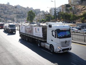 وتتكون القافلة التي عبرت جسر الملك الحسين من 38 شاحنة مساعدات إنسانية، وذلك بالتعاون مع برنامج الغذاء العالمي، وبالتنسيق مع القوات المسلحة الأردنية – الجيش العربي.