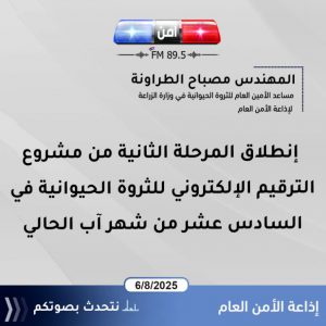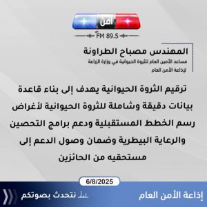 وأوضح في حديثه لإذاعة الأمن العام أن هذه المرحلة ستتم من خلال ثلاث لجان متخصصة تعمل بالتتابع، لضمان دقة التنفيذ وضبط العمليات الميدانية خلال زيارة كل حائز للأغنام.