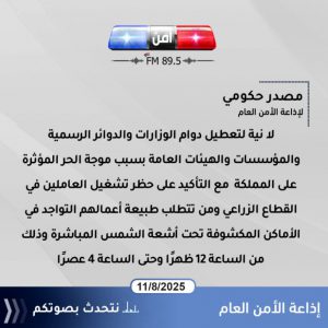 مصدر حكومي لإذاعة الأمن العام : لا نية لتعطيل دوام الوزارات والدوائر الرسمية والمؤسسات والهيئات العامة بسبب موجة الحر المؤثرة على المملكة مع التأكيد على حظر تشغيل العاملين في القطاع الزراعي ومن تتطلب طبيعة أعمالهم التواجد في الأماكن المكشوفة تحت أشعة الشمس المباشرة وذلك من الساعة 12 ظهرًا وحتى الساعة 4 عصرًا.