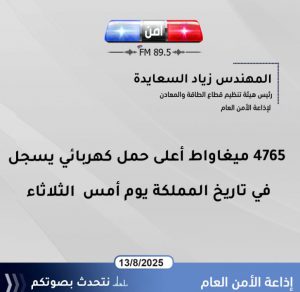 عمان 13 آب (أمن إف إم) – قال رئيس هيئة تنظيم قطاع الطاقة والمعادن المهندس زياد السعايدة إن المملكة سجلت يوم أمس أعلى حمل كهربائي في تاريخها بلغ 4765 ميغاواط نتيجة الاستهلاك الكبير للطاقة الكهربائية بالتزامن مع ارتفاع درجات الحرارة.